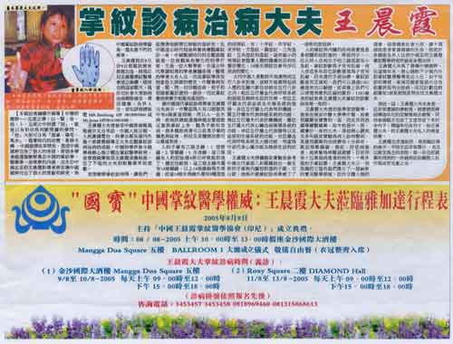 2005年8月9日大篇幅介绍“中国王晨霞掌纹医学协会(印尼)”成立大典