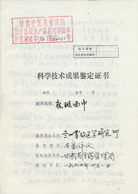1994年4月1日,“祛斑面巾”通过甘肃省医药管理局医疗器械新产品鉴定审批[甘医械准字(94)第364022号]。