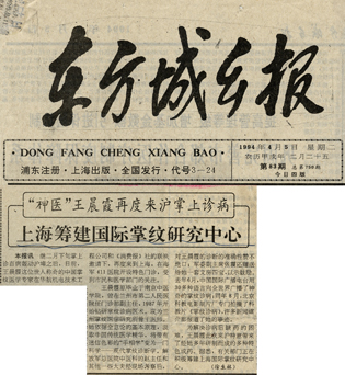 1994年4月5日《东方城乡报》“神医王晨霞再度来泸掌上诊病”上海筹建国际掌纹研究中中心。
