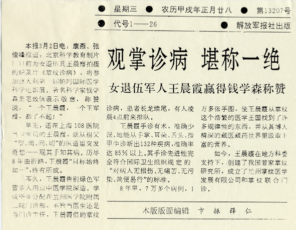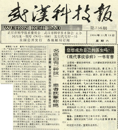 · 1994年3月2日《解放军报》刊登“观掌诊病 堪称一绝”