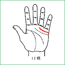 起于1线与小指根线中部,斜行连到1线的无名指的下方,有些人可与小指下横曲线相连。有12线的人多嗜酒,或不能饮酒,一饮即醉,而且这些人肝脏对酒精的解毒能力下降,常易患酒精中毒型肝硬化。